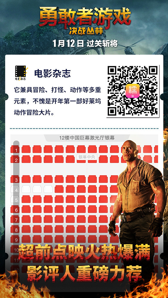 影片在北美上映四周依然坚挺,单日票房持续力压《星球大战8》,累计票房超过2.4亿美元。同时,《勇敢者游戏》于1月7日在国内41座城市开启百场点映活动,当日以84.2%的超高上座率成为卖座冠军,更是在猫眼和豆瓣上取得了9.0和7.5的超高评分。首批观众更迫不及待表达对这部电影的喜爱,“全程无尿点”“全场笑声此起彼伏”这样的评论比比皆是。更有人放言:刺激又欢乐的《勇敢者游戏:决战丛林》毫无疑问将成为开年第一合家欢电影。