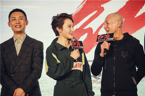 当主持人让各位主创讲述自己参演这部电影最大的感受时,蒋璐霞爆料到,刚进组就被林超贤导演“逼迫”剃了板寸,加之她饰演的机枪手佟莉在整部影片中拿的武器是最重的,因此要不断健身,才能保证自己不会“掉队”。
