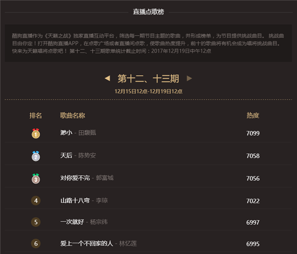 先回顾一下酷狗直播歌单是怎么回事。作为节目的独家直播互动平台,酷狗直播会筛选每一期节目主题的歌曲做成歌单,而酷狗直播网友通过点歌挑出的那些最热曲目就成了天籁唱将的备选曲目。初赛中是由选手给唱将选歌改编,为了看到更有趣味性的节目,网友们投票也都是往高难度的方向,什么《葫芦娃》、《魂斗罗》都出来了。