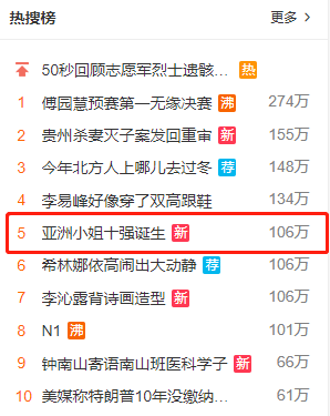 9月28日,2020 亚洲小姐全球网络赛区决赛如期在北京千禧大酒店举行。虽然这是亚洲卫视与映客平台的首次合作,但得益于映客背后亿万级的用户数量,亚姐选举获得了前所未有的关注,尤其是最后一场网络赛区决赛,还未播出就以106万人次、近亿阅读的热度冲上了微博热搜榜第五名,当晚直播更是达到了上百万人次的收看纪录。