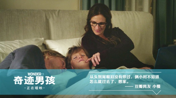影片《奇迹男孩》在专业电影评论网站IMDb上评分高达8.1,烂番茄新鲜度达到86%的高分。《奇迹男孩》将温暖励志的故事与阳光积极的价值观熔于一炉,又巧妙地插入了不少“星战”梗,这样寓教于乐的方式俘获了不少家长和孩子的“芳心”,“长相与众不同的奥吉,映射并释放出了身边人内心的友善、热情和勇敢,能结识他,是一种天赐的幸运,也是生命宝贵的礼物”等好评层出不穷。家长们更是在网上呼吁增加国语场次,让孩子们能更好地理解电影阳光正向的内涵,有家长表示,“每个人都害怕被歧视和遗弃的恐惧,这一点我们和奥吉没有区别,小孩子们可以切身分享他的情绪,也可以从他的经历中,汲取面对生活的勇气”“对孩子们来说,国语版的友好程度应该会更高,如果以后看到国语排片的话,一定会带孩子去二刷!”