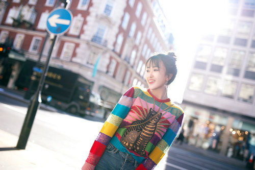 蕊希时尚街拍彩虹糖毛衣凸显满满少女心