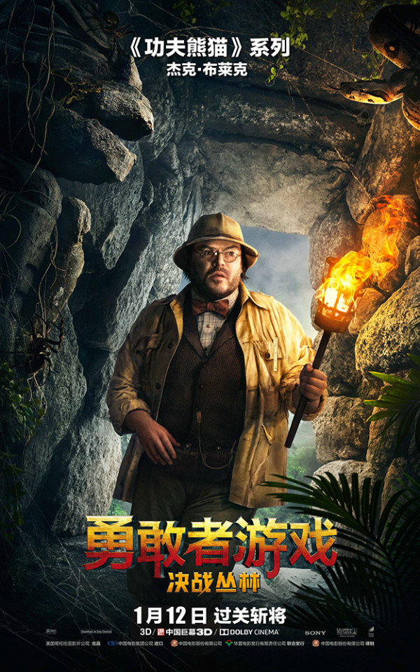 最新发布的“技能开挂”预告和角色海报对四位主角的特殊技能进行了展示。斯莫德·勇石博士是小队的核心,他拥有“令人窒息的性感凝视”、“比子弹还快的惊人速度” 、“攀援的技巧”、“熟练使用武器” 等优势。他的缺点?暂时没有。莫森·芬巴是一个动物学家和武器支援者,他也是唯一的身上有宝藏的队员:他始终背着一个神秘的双肩背包。萝比·旺德豪斯是超级女战神,她曼妙的身材与清凉的装扮足以令无数男人不战而败。当她使出独家“战舞”技能时,没有一个人可以躲开如此攻势。而全队的“搞笑担当”当属谢利·奥布伦教授,他是位制图学、考古学和古生物学专家。难以想象这位戴着眼镜、身体超重的中年壮汉“真实身份”竟是美艳风流的超级校花,而因此带来的反差,也令谢利·奥布伦教授的身上笑点无穷。有北美影评人评价杰克·布莱克在《勇敢者游戏:决战丛林》的表现 “可以拿12座奥斯卡小金人”!