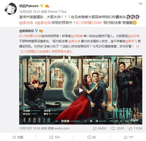据悉,柏辰的新作品会和近期因老tfboys而声名大噪的李光洁合作,而就在前几日,由李光洁领衔主演的院线电影在全国上映,身为光洁大哥的后辈,柏辰也是第一时间转发并支持。