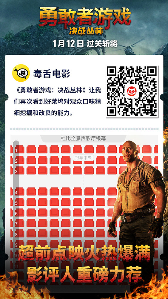 影片在北美上映四周依然坚挺,单日票房持续力压《星球大战8》,累计票房超过2.4亿美元。同时,《勇敢者游戏》于1月7日在国内41座城市开启百场点映活动,当日以84.2%的超高上座率成为卖座冠军,更是在猫眼和豆瓣上取得了9.0和7.5的超高评分。首批观众更迫不及待表达对这部电影的喜爱,“全程无尿点”“全场笑声此起彼伏”这样的评论比比皆是。更有人放言:刺激又欢乐的《勇敢者游戏:决战丛林》毫无疑问将成为开年第一合家欢电影。