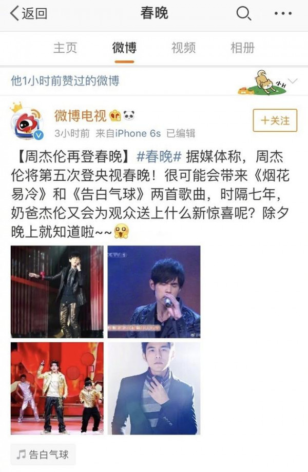 近日,网传周杰伦将时隔七年再度登上春晚的舞台。如果属实,这也将是他第五次登台。1月24日,有眼尖的网友发现春晚的官方微博已经点赞了周杰伦即将登台的消息,令粉丝和网友们翘首以待,并猜测周董会带哪只歌曲一同前往春晚的舞台。