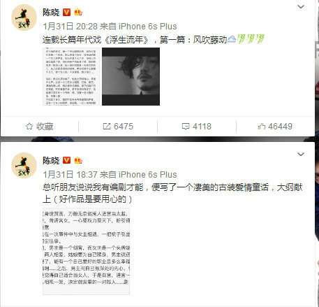 陈晓写的第一个故事是关于太监和宫女的“凄美的古装爱情童话”,网友在评论区纷纷留言互动,陈晓还十分乐在其中地回复网友说“不知道自己能不能成为一个网络作家”。当天晚上,陈晓发布了第二个故事,是他最近热更的“长篇年度大戏”——《浮生流年》,背景是1920年的上海,讲述了一个名叫阿伟的普通演员身上发生的离奇故事。截止目前《浮生流年》已经更新到第六章,剧情画风也是一波三折神展开,由开始的悬疑惊悚逐渐变成主角励志追梦,而后又突然转折成一个喜剧故事,陈晓天马行空的故事走向让网友直呼“剧情有点迷”,同时,这意想不到的剧情展开也成功吊起了网友的胃口,并引起了网友们追文热潮,日日等陈晓更新。