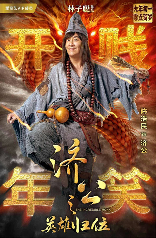人物海报中,济公陈浩民,嘴角微扬,手持济公扇,威风凛凛,不禁让人想起他救民众于水火之中时的潇洒模样;胖仙童林子聪极具感染力的笑容,仿佛可以治愈全世界的不开心;玉皇大帝王晶、伏虎罗汉陈国坤、九天玄女转世杨能、哪吒转世罗家英各以搞笑、呆萌的形象亮相,人物扮相充满喜感,透过这组人物海报我们就能感受到这部网络电影的“笑果”,逗趣搞怪欢乐不断。