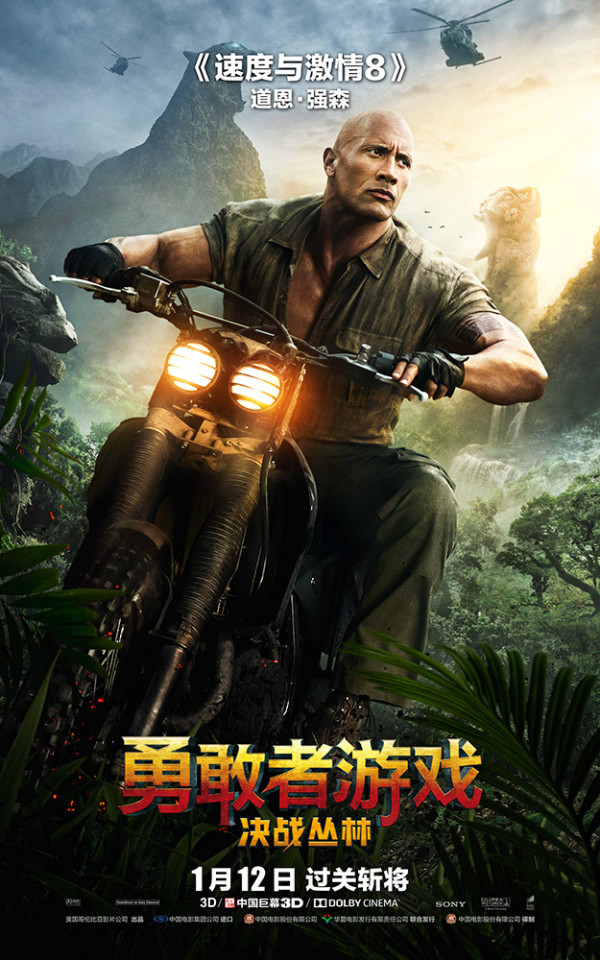 由巨石强森、凯文·哈特、“阿宝”杰克·布莱克、 “星云”凯伦·吉兰、尼克·乔纳斯等一线好莱坞群星联袂主演的动作冒险巨制《勇敢者游戏:决战丛林》已经定档2018年1月12日,主演巨石强森有望带上这部诚意之作来到中国,与影迷见面。