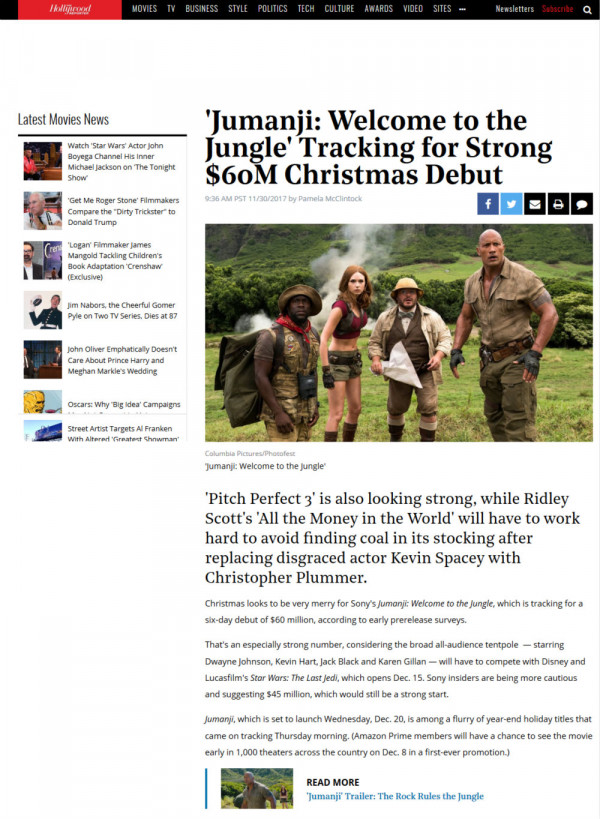 《勇敢者游戏:决战丛林》将于2017年12月20日北美上映,近期电影刚结束在夏威夷的首映活动。权威杂志《好莱坞报道》在分析数据和收集口碑后,预测电影开画强劲,极可能领跑今年北美圣诞档。《好莱坞报道》称:“《勇敢者游戏:决战丛林》有望在映内6天取得6000万美元的票房,这将是一个势头强劲的动作巨制。”