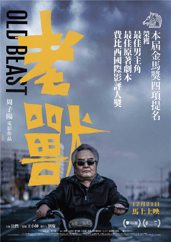 昨日,《老兽》在香港举行了一场特别放映,映后不少观众泪腺崩溃,对片中涂们饰演的角色痛恨之余,还为之动容,感叹道:“每个人身边都有一头老兽。”今日,片方宣布《老兽》将于12月21日在中国香港上映,随即曝光香港版海报及预告片,影片从第54届台湾电影金马奖、第30届东京国际电影节、第11届FIRST青年电影展满载荣誉而归,导演周子陽用现实与超现实结合的方式呈现典型的现代家庭代际关系,与金马影帝涂们饰演的内蒙古老炮儿携手,跨越空间再度引爆港岛同胞们的观影期待。